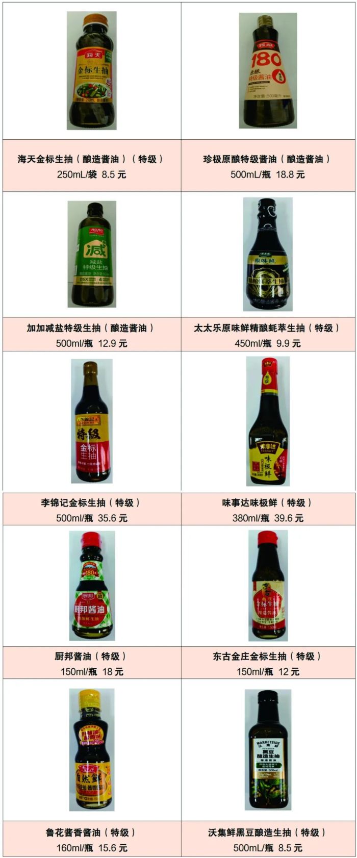 本次比较试验的样品由桂林市消费者协会工作人员以消费者身份从商场、超市随机购买,包括海天、东古、鲁花、厨邦、李锦记、加加、味事达、太太乐、珍极、沃集鲜等10个品牌的10款特级酱油,单价从8.5元至39.6元不等。