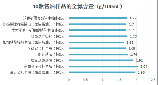 2.全氮项目测试。全氮是酱油中所有含氮物质的总和,直接关联酱油的鲜味强度、发酵程度及营养水平,全氮值越高,通常表示酱油发酵工艺越成熟、营养价值越丰富。GB/T 18186-2000《酿造酱油》规定特级酱油的全氮含量≥1.5g/100mL。测试结果显示,10款特级酱油样品的全氮含量均符合产品明示执行标准和等级要求,其中“东古”“鲁花”“海天”3款特级酱油样品的全氮含量超过1.9g/100mL,表现优秀。