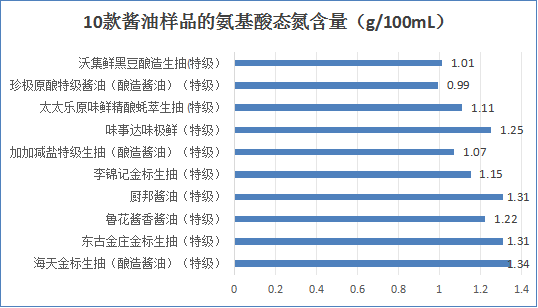 1.氨基酸态氮项目测试。氨基酸态氮是判定酱油发酵程度的指标,酱油中的氨基酸态氮含量越高,鲜味越好,品质越好。GB/T 18186-2000《酿造酱油》规定特级酱油的氨基酸态氮含量≥0.8g/100mL。测试结果显示,10款特级酱油样品的氨基酸态氮含量均符合产品明示执行标准和等级要求,其中“东古”“厨邦”“海天”3款特级酱油样品的氨基酸态氮含量超过1.3g/100mL,表现优秀。