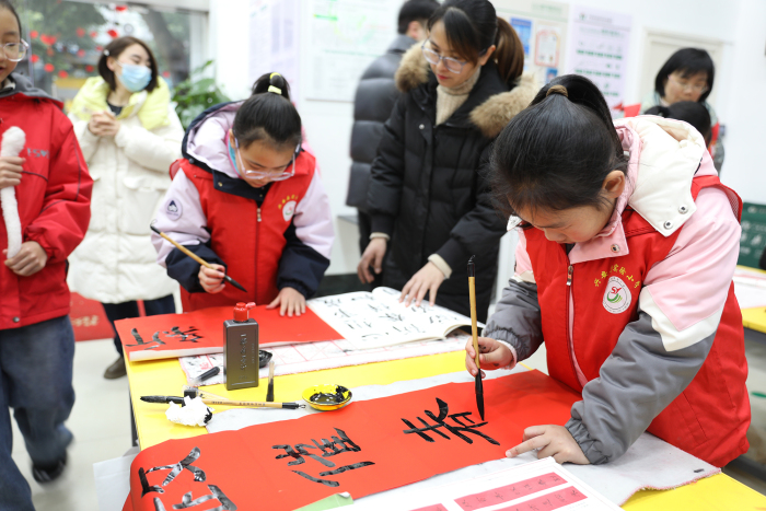 活动现场翰墨飘香、暖意涌动。志愿者与学校师生凝神挥毫,笔墨流转间,将新春期许与美好祝福凝于笔端,一副副字迹遒劲的吉祥春联、一个个饱满喜庆的“福”字接连出炉。群众驻足围观、笑意盈盈,纷纷挑选心仪的春联;社区工作人员协助维持秩序,让活动有序开展。此外,志愿者提前备好一碗碗热气腾腾的汤圆,亲手递到群众手中,既传递着新春暖意与赤诚关怀,更让软糯香甜的滋味浸润心间,为冬日增添了浓浓温情。