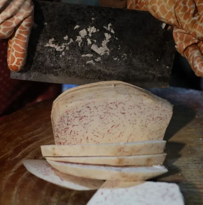 年前,记者登岛走进蚂蟥洲船上糕制作现场,目睹了一场充满烟火气的家庭协作。制作过程像是一场力量与精巧的完美结合,女子负责将芋头、腊肉、木耳等食材细细切丁、炒香,完成前期的精细活;男子则承担起搅拌、捣碎米浆等需要气力的步骤。