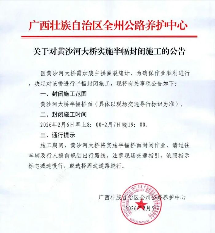 因黄沙河大桥需加装主拱圈裂缝计,为确保作业顺利进行,决定对该桥进行半幅封闭施工,现将有关事项公告如下:
