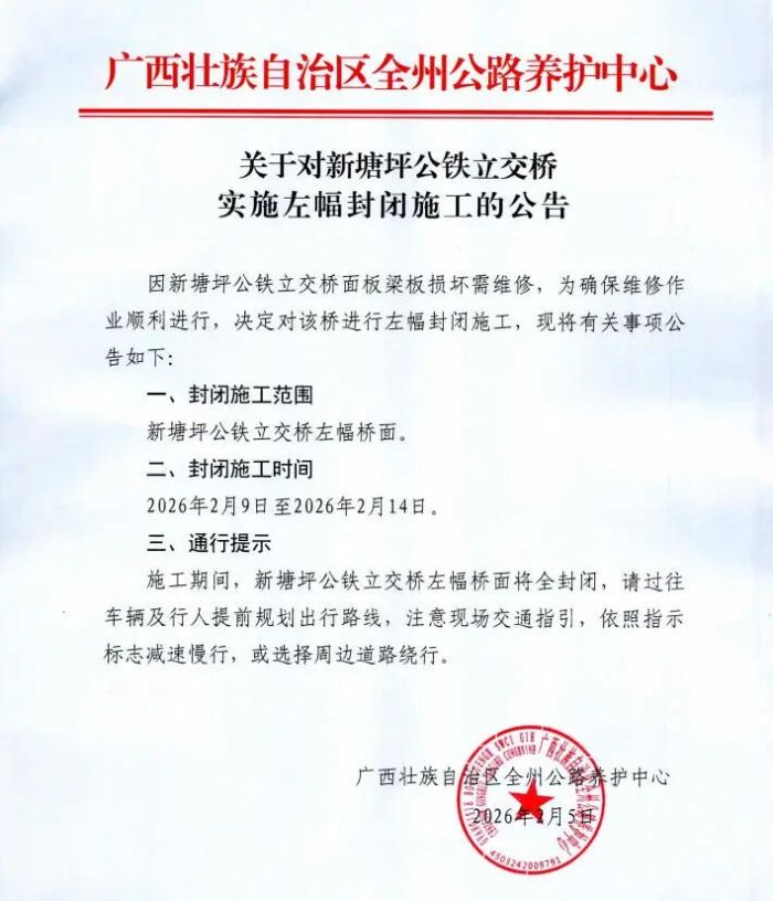 因新塘坪公铁立交桥面板梁板损坏需维修,为确保维修作业顺利进行,决定对该桥进行左幅封闭施工,现将有关事项公告如下: