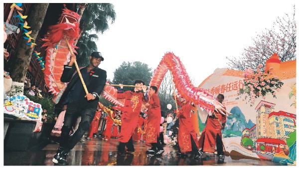 ▲外国留学生进行舞龙表演。