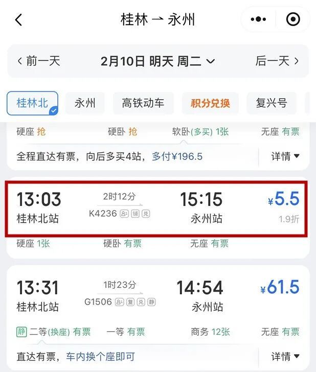 节后2月17日至3月13日,对广州开往南宁K4154次、杭州开往南宁K4235次、南京开往湛江K4251次、长沙开往南宁K4423次共计4趟次普速列车实行全程票价优惠,其中K4154次硬座低至2折。