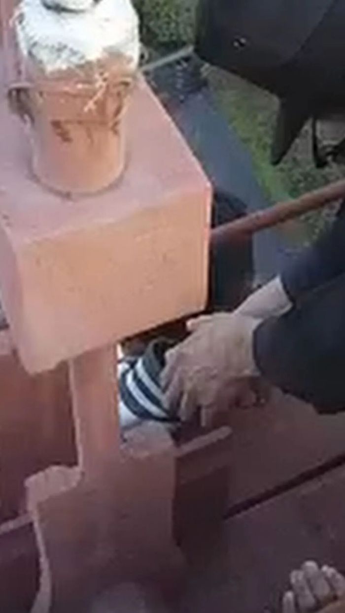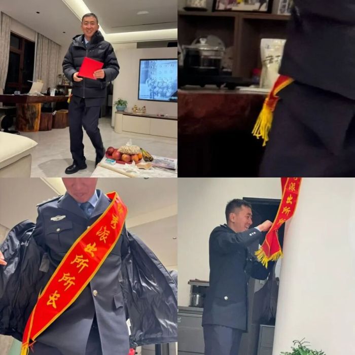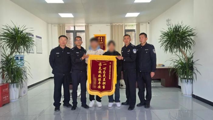 获救少年和家人向民警张李国(右二)与民辅警送来锦旗。新华社发