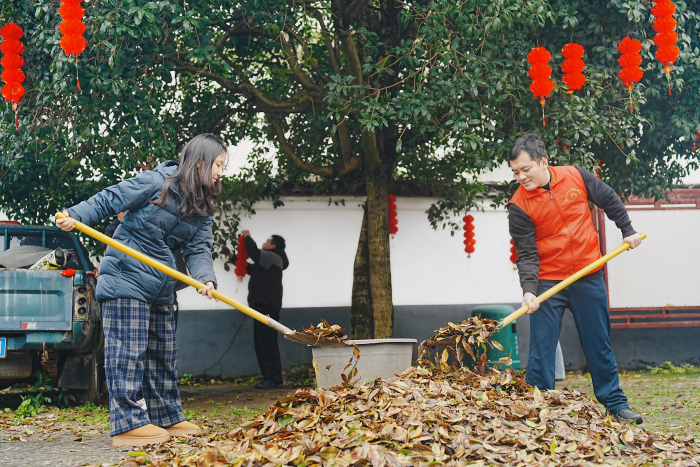 近年来,广西阳朔县以“党建引领城乡环境整治”为抓手,组建“党员先锋队+志愿服务队”,通过网格包联、现场示范等形式,带动群众整治人居环境,凝聚起共建和美家园的合力。图为近日,白沙镇遇龙村党员干部带领群众开展环境整治美化行动,以干净整洁、喜气洋洋的村容村貌迎接马年新春。