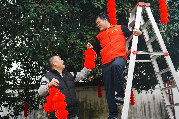 新春佳节临近,广西阳朔县组织党员干部开展新春暖心慰问活动,为辖区留守老人送上节日祝福。图为近日,阳朔县党员干部深入乡村,帮助留守老人布置庭院、打扫卫生,贴春联、挂灯笼,与老人共话家常,切实把关怀和祝福送到群众心坎上。