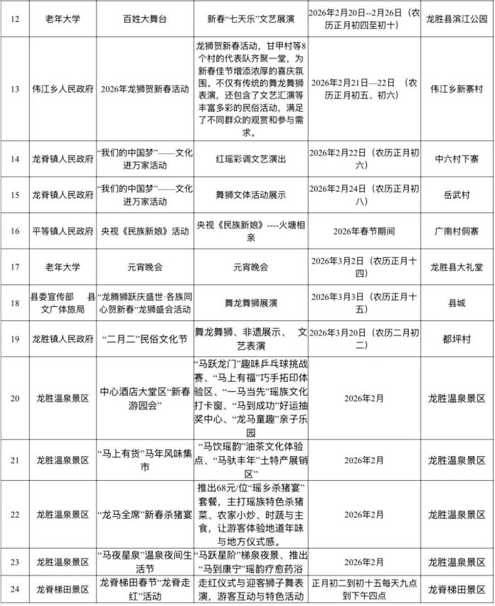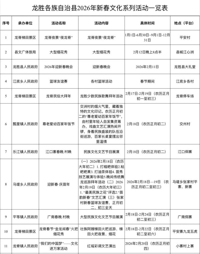 苗、瑶、侗、壮,少数民族风情看不够,年前来有春晚,过年来有“村晚”!我们不仅有民族服装秀、龙狮巡游,还有机会看到非遗项目舞草龙草狮!岩坪调、琵琶歌,还能亲身体验一下民族传统节庆—“闹春牛”。打糍粑,打篮球,热力十足,氛围感爆棚!夜游龙脊,让您感受千层天梯不一样的妩媚。特色美食畅快吃,瓢里鱼生、三门烧烤、侗家“三宝”,总有一款适合您。广西“公文包”畅快喝,百家宴只要你想吃就安排!