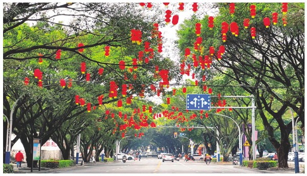 近日,七星区骖鸾路悄然换上新装。绿树长廊间,红灯笼错落悬挂,洋溢着热闹喜庆的新春气息。 记者周子琪 摄