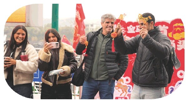 走进竹江客运港,年味十足的“九马送福”大型条幅,让每一位准备登船的游客都感受到了节日的氛围。条幅前,身着传统服饰的工作人员举着鱼灯,与游客拉着手围成圈载歌载舞。在“金马抬首 鸿运当头”套圈游戏打卡处,小朋友们排队体验,“套取”马年福运,赢新年礼品。