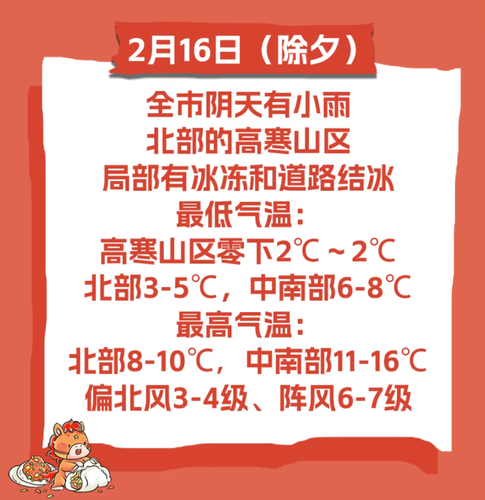 2月16日(除夕),全市阴天有小雨,北部的高寒山区局部有冰冻和道路结冰。偏北风 3-4 级、阵风 6-7 级。最低气温:高寒山区零下 2℃~2℃,北部3-5℃,中南部6-8℃;最高气温:北部 8-10℃,中南部11-16℃。