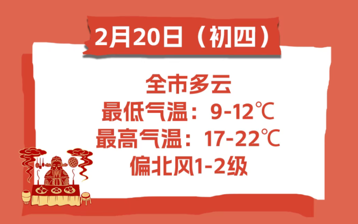 2月20日(大年初四),全市多云。偏北风 1-2 级。最低气温:9-12℃;最高气温:17-22℃。
