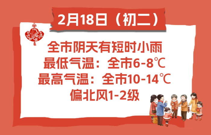 2月18日(大年初二),全市阴天有短时小雨。偏北风1-2级。最低气温:全市6-8℃;最高气温:全市10-14℃。