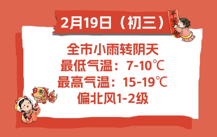2月19日(大年初三),全市小雨转阴天。偏北风1-2级。最低气温:7-10℃;最高气温:15-19℃。