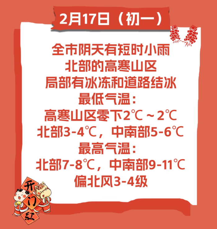 2月17日(大年初一),全市阴天有短时小雨,北部的高寒山区局部有冰冻和道路结冰。偏北风 3-4 级。最低气温:高寒山区零下2℃~2℃,北部 3-4℃,中南部 5-6℃;最高气温:北部 7-8℃,中南部 9-11℃。