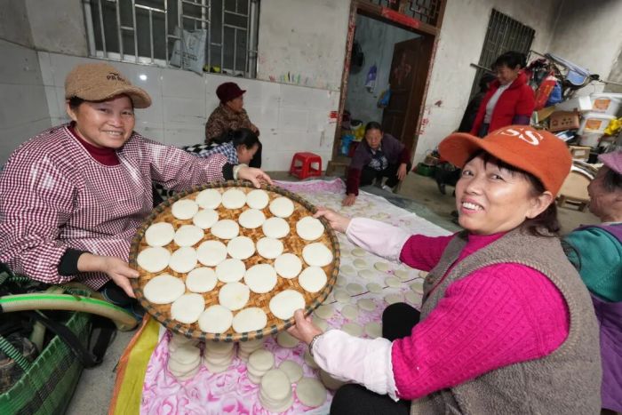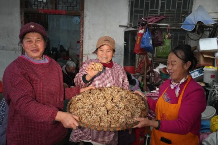 春节临近,年味愈浓。走进黄业妹家的小院,红红火火的柴火灶烧得正旺,热气腾腾的糯米香弥漫在空气中。男女老少围在一起,欢声笑语不断。今年,黄业妹早早准备了将近200斤糯米,村嫂们早早就聚拢了过来。头天晚上就泡上的糯米装在三个大大的木桶里。一锅锅煮好的糯米饭倒进石臼里,村里的男子也来帮忙打糍粑,打得糯米松软细腻。随后,村嫂们分工合作,揪,搓,按,压,甩,一套娴熟的手法下来,上千个糍粑就铺满了。