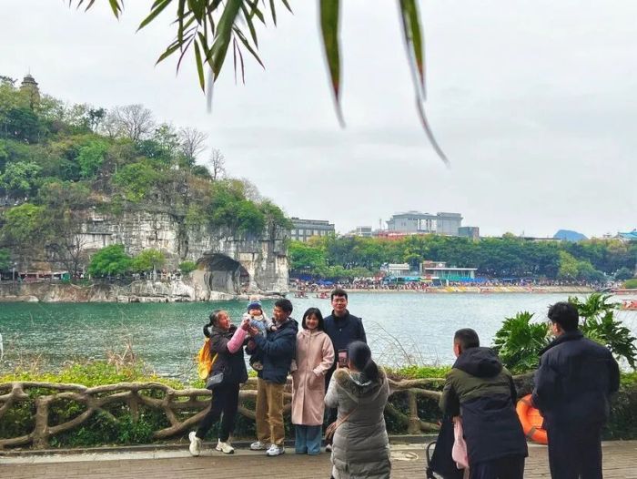 人们在訾洲公园里与对岸的象鼻山合影。记者周子琪 摄