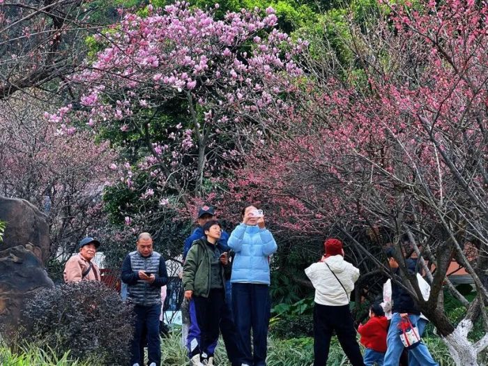 离开訾洲公园,记者又来到穿山公园,这里同样人山人海、年味浓郁。景区入口处、沿江步道上,游客络绎不绝,大家有序游览、兴致盎然。园内成片的梅林次第铺展,宫粉梅、朱砂梅、绿萼梅等品种竞相绽放,花枝间,有的花朵完全舒展、吐露娇嫩花蕊,有的仍是饱满花骨朵、饱含生机。微风拂过,阵阵幽香沁人心脾,勾勒出一幅生机盎然的新春画卷。“过年跟家人一起徜徉在花海之间,特别幸福。”市民李女士一边用手机记录美景,一边笑着说,看着满树繁花,真切感受到了春节的喜庆氛围。