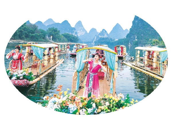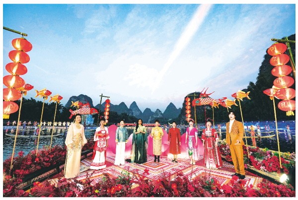 歌手、演员们与历代“刘三姐”的扮演者及数百位传唱者齐聚漓江之上,重现电影《刘三姐》中对山歌的经典画面,共演山水画卷《山歌好比春江水》。记者何平江 摄