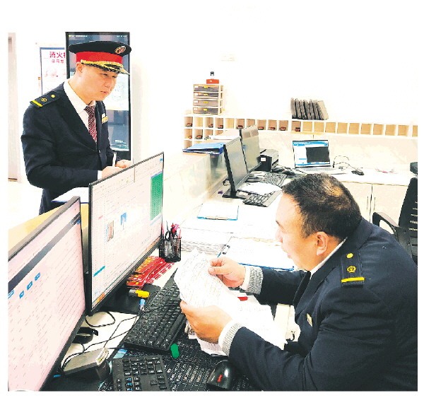 ▼机车调度员唐玉成(右一)在给动车组司机办理出勤手续。 通讯员蒋均发 摄