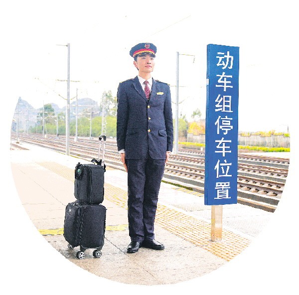 ▼动车组司机李玉杰在桂林西站立岗接车。 记者苏展 摄