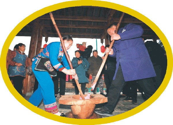 ▲村民给游客展示打粑粑。