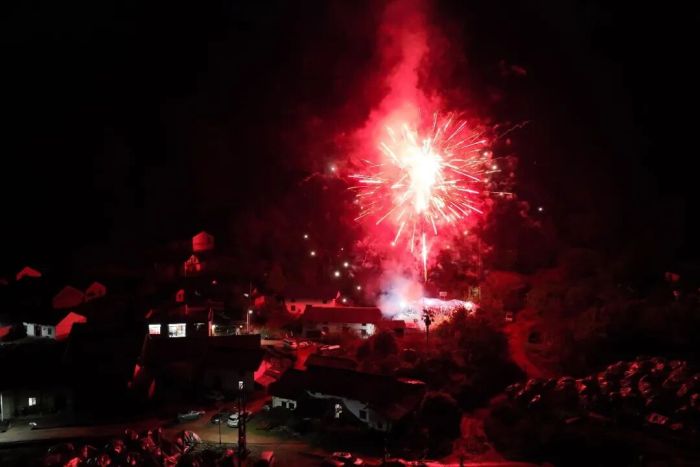 席间,一声“放烟花喽”打破喧闹,孩子们欢呼着冲出雨棚,望向上空。