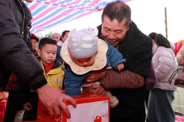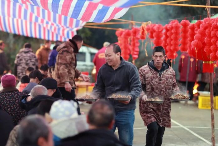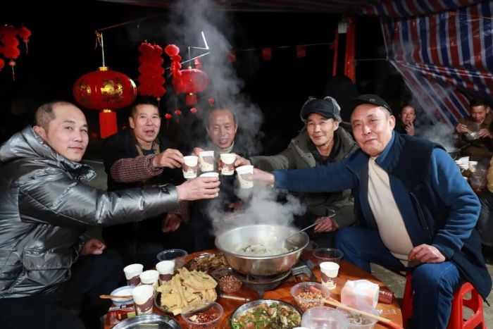 雨棚下,返乡的青壮年围炉闲谈,满是久别重逢的欣喜;孩子们穿着新衣追逐嬉闹,清脆笑声穿透雨棚;临时灶台前人影攒动,男女老少齐上阵,动手切肉切菜,忙碌身影里透露着久违的烟火气。