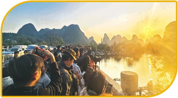 图③:2月20日傍晚,在阳朔工农桥上,许多游客被这久违的夕阳吸引,纷纷拿出手机拍摄下这美丽瞬间。 记者滕嘉 摄