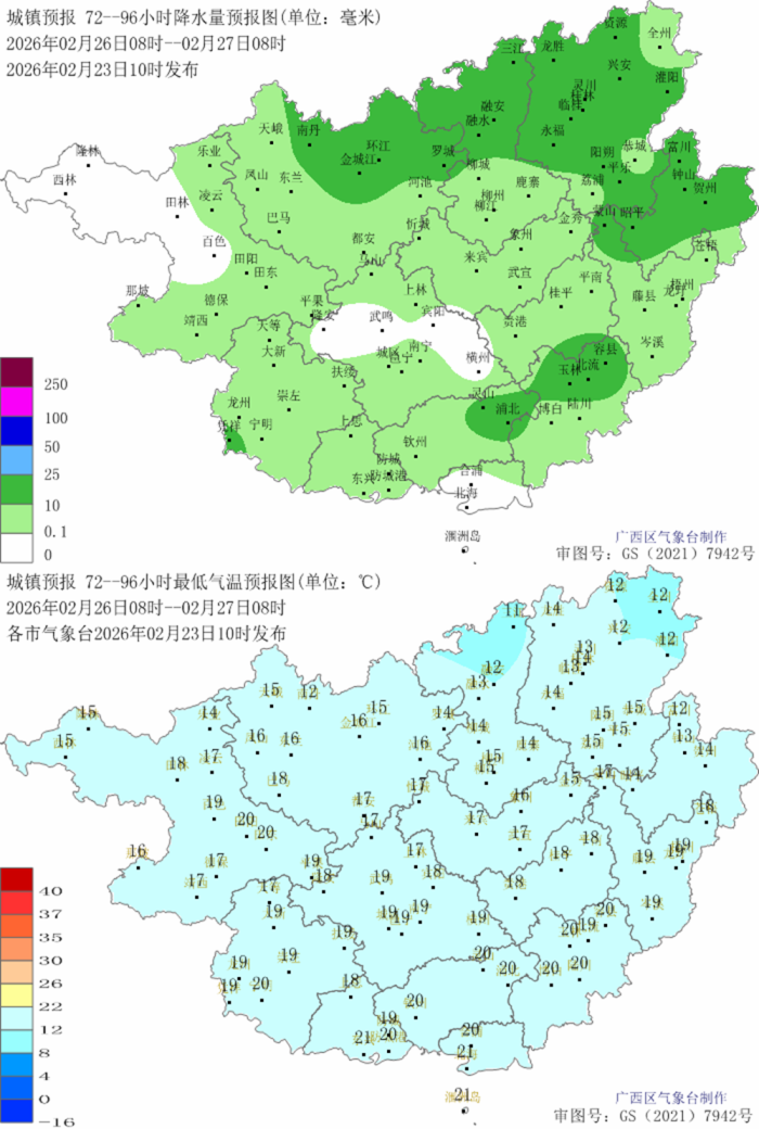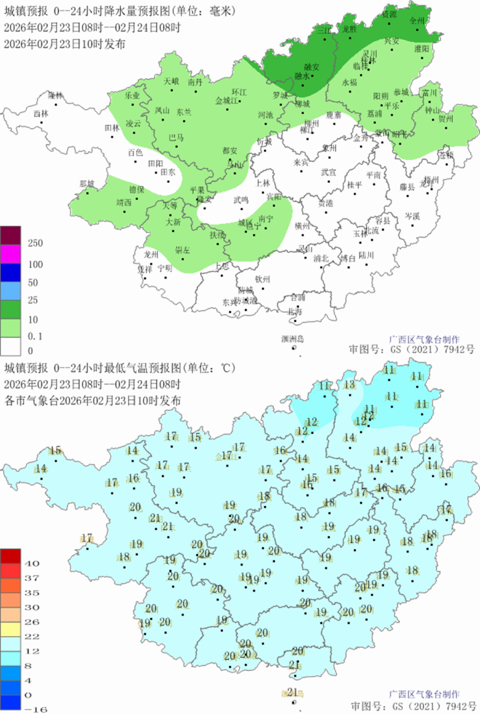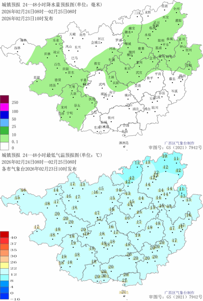 24日白天到晚上,桂北、桂西阴天有小雨、局地中雨,其他地区阴天到多云有分散小雨。最低气温:桂东北10℃~16℃,其他地区16℃~21℃。