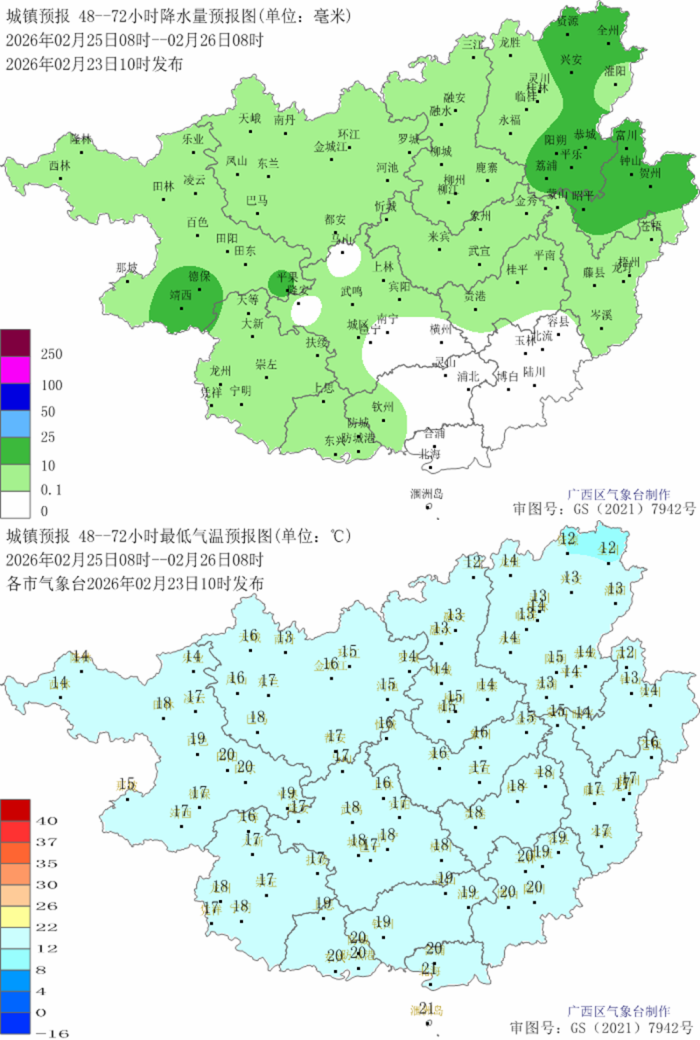 25日白天到晚上,桂东、桂南阴天有小到中雨、局地大雨,其他地区阴天有分散小雨。最低气温:桂东北11℃~16℃,其他地区16℃~20℃。