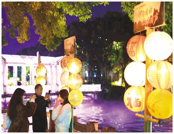 春节假期,我市各大景区、景点都装扮一新。在榕湖边的一处亲水平台前,游客在喜庆的灯笼前打卡拍照。