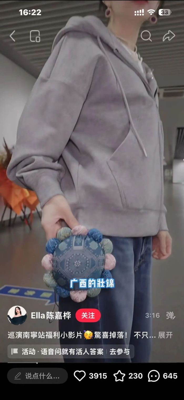 “这是用广西壮锦制作的太阳小挂件,这是耳环、发夹。这些壮锦真的深得我心,我真的很喜欢!”日前,知名女星陈嘉桦(Ella)在南宁举办了第十场Ella爱拉主意演唱会。她身上的民族风挂件吸引了许多人的注意。陈嘉桦在个人社交媒体上,也发了一条Vlog,言谈间难以掩饰自己对壮锦饰品的喜爱。而这些精美又具有辨识度手工饰品,正出自我市手工艺人李岢之手。