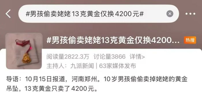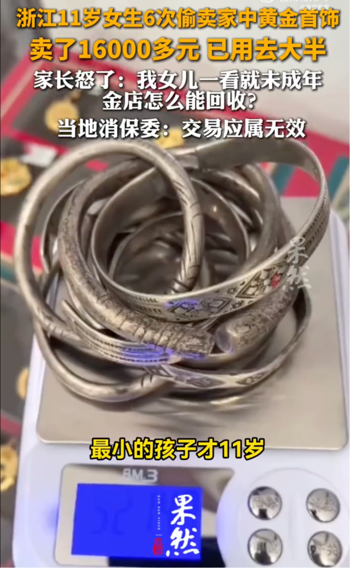 不久前,“11岁女孩偷卖家长黄金”的消息,也登上微博热搜。浙江绍兴张先生家里的黄金项链、耳环足足20多克,被孩子拆成6次偷卖到金店,换了16000多元。