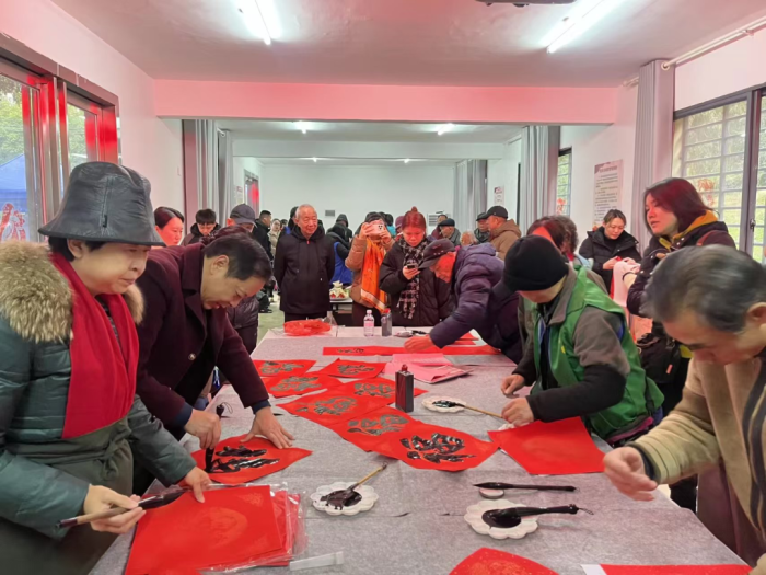 “翰墨送福”区人气最旺,书法爱好者被围在中间,挥毫泼墨间,一张张灵动飘逸的福字和喜庆吉祥的春联刚写好就被接走。孩子们踮着脚围观,居民们捧联细品,欢声笑语此起彼伏。