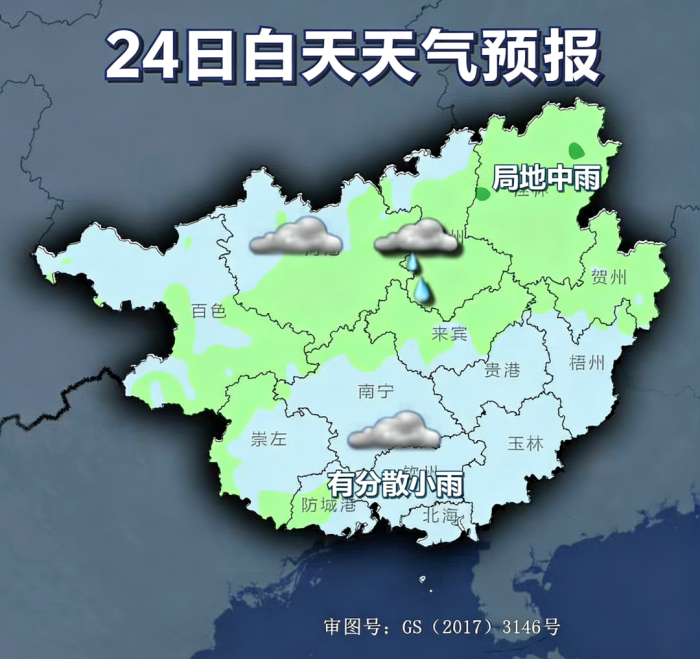 今天白天,桂林、柳州、河池、百色、贺州等市阴天有小雨、局地中到大雨,其它地区多云到阴天有分散小雨。