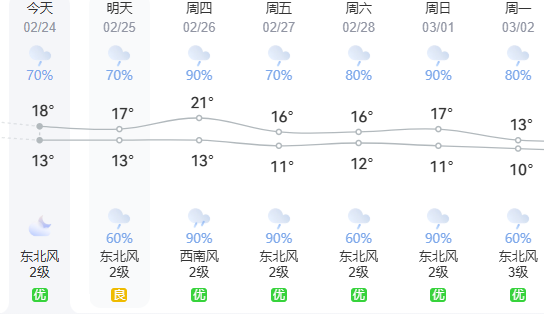 25日,全市多云间阴天,北风1~2级,最低气温9℃~13℃,最高气温14℃~18℃。