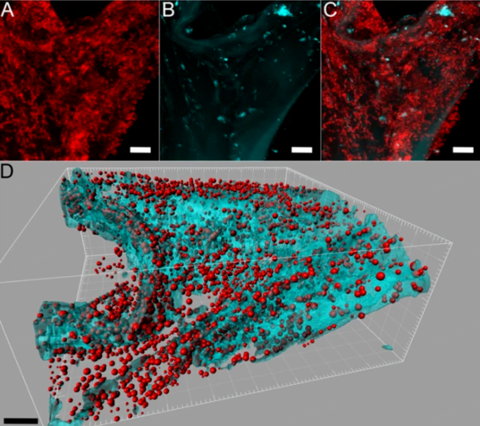 种类繁多的细菌几乎在海绵中的各处均有分布;图中的红色代表细菌菌落,青色则是海绵的自发荧光。图源:参考文献