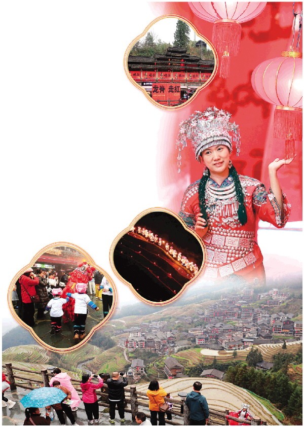 傍晚,当地村民手持火把,舞动龙灯,从九龙五虎观景平台下方梯田沿步道蜿蜒而上。火把与龙灯渐次汇流,连成一条盘旋山间的“金色巨龙”,与蓄水如镜的梯田交相辉映。紧随其后的梯田烟花秀璀璨腾空,照亮古寨与张张笑脸,美丽夜景引得游客纷纷驻足赞叹。