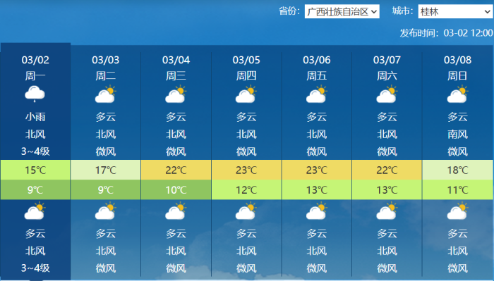 再看桂林天气,上周桂林经历了一次较明显的降雨过程,平均气温在13.5℃至16.4℃之间,较常年同期偏高2.2℃至4.8℃,让人们提前感受到了春日的暖意