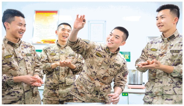武警官兵们在食堂里揉搓汤圆馅料,现场欢声笑语不断。 通讯员戴申澳 摄