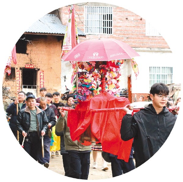 清晨,薄雾尚未散尽。尽管下起了淅淅沥沥的小雨,石口屯的家家户户人头攒动,村民们打扫庭院,拿着预备好的鞭炮张望着、期待着。上午9时许,花炮巡游仪式正式开始。在铿锵的锣鼓声中,村民们抬起精心制作的花炮,由去年的福主护持,沿村寨巡游祈福。队伍前方,舞狮队腾挪跳跃、神采飞扬,身着传统瑶族服饰的表演者跳起羊角舞、长鼓舞、“跑梅山”等非遗舞蹈,舞步刚劲有力、韵律十足,再现瑶族先民狩猎、祭祀、欢庆的生活场景,引得沿途群众阵阵喝彩。巡游队伍所到之处,家家户户燃放鞭炮,孩童们追着队伍奔跑欢笑,古老的村落被浓浓的节日氛围和年味包裹。
