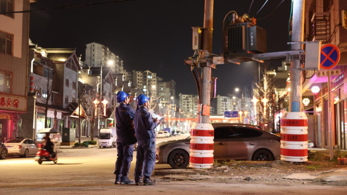 正月十五元宵夜,广西桂林市恭城瑶族自治县滨江路灯火璀璨,人潮涌动。沿街的花灯次第亮起,映照着人们的笑脸。而在熙攘的人群之外,几名身穿蓝色工装的供电人员正手持测温仪,沿着街道仔细巡查环网柜和配电设备。