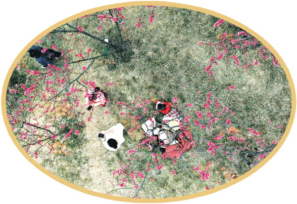 ▲空中俯瞰,桃花灼灼,市民树下休闲打卡,尽享烂漫春光。 文小静 摄