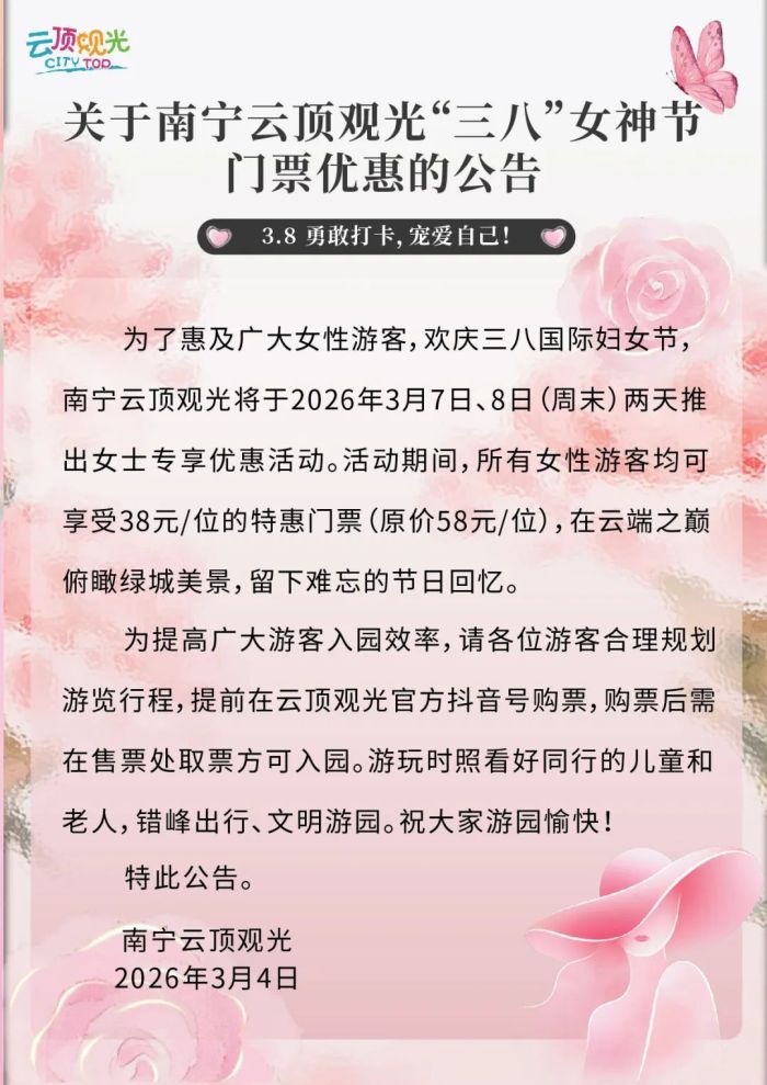 3月4日,南宁市云顶观光发布公告,将于3月7日、8日(周末)两天推出女士专享优惠活动。活动当天,所有女性游客均可享受38元特惠门票(原价58元),在云端之巅领略绿城风采。