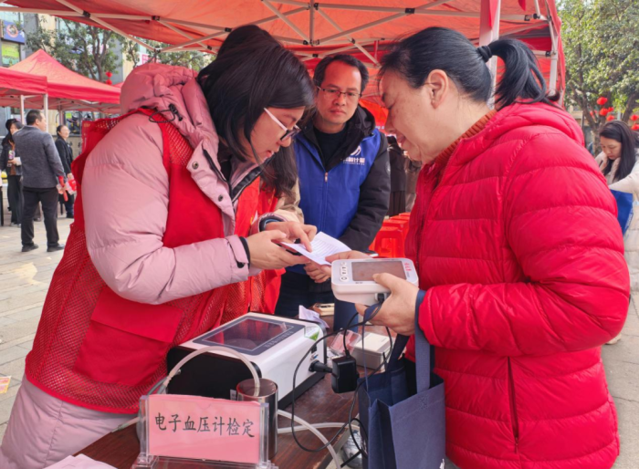 ▲志愿者为居民免费检定血压计