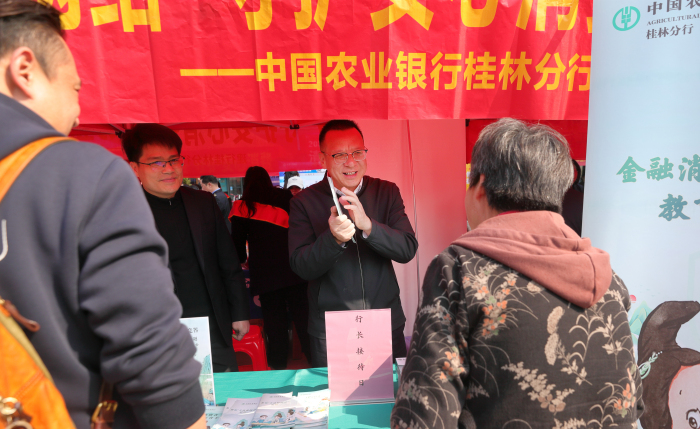 活动现场,农行桂林分行积极参加,并通过设立宣传咨询台、悬挂横幅、发放宣传折页及“金融知识有奖竞答”等特色宣传等方式,向广大市民普及金融知识。
