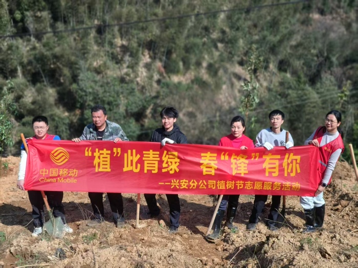 “植”此青绿,春“锋”有你。在兴安县国有摩天岭林业总场半冲分场,桂林移动党团员志愿者队伍积极参与兴安县2026年全民义务植树活动。植树现场,党旗飘扬,志愿者们热情高涨,分工协作,认真完成每一道工序。经过一上午的辛勤劳动,100余株新苗在此“安家落户”,为初春大地再添一片新绿。今年已是桂林移动在兴安连续第十年参与此项活动。十载深耕,绿润兴安,桂林移动始终将义务植树作为锤炼党性、服务社会、践行绿色发展的重要平台,将生态环保理念深度融入企业文化和日常运营,通过推广绿色产品服务、常态化组织环保志愿活动等方式,不断提升员工的环保素养与实践能力,让绿色发展理念内化于心、外化于行。