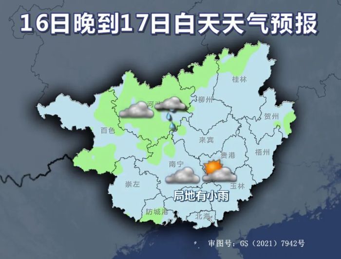 16日晚上到17日白天,桂北阴天部分地区有小雨,桂南阴天到多云局地有小雨。